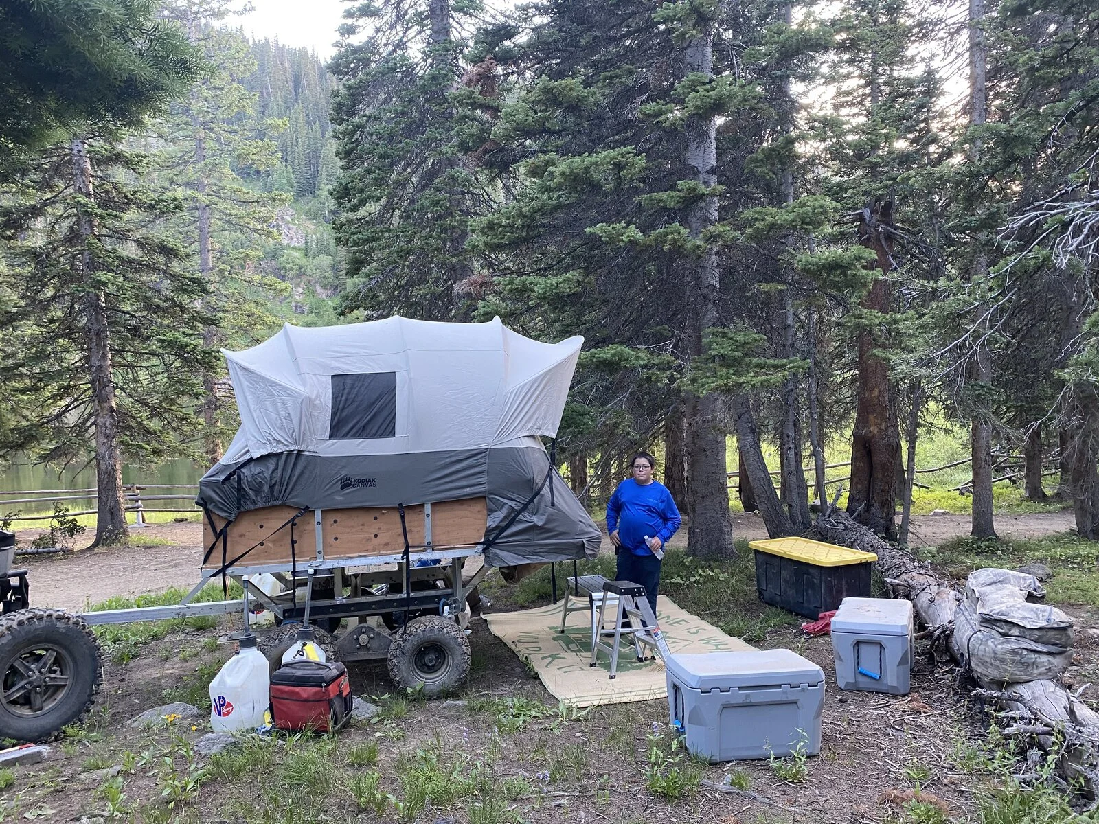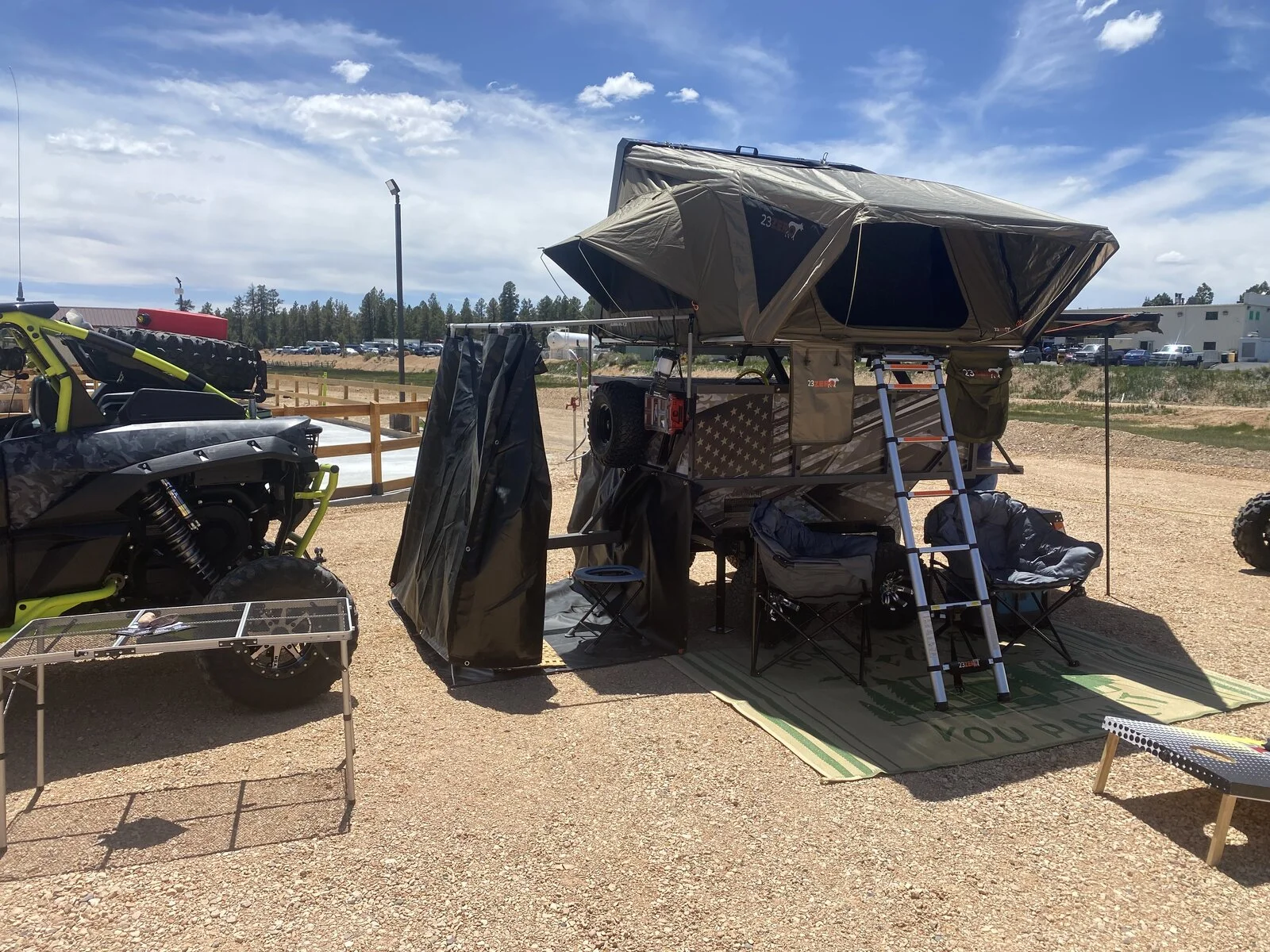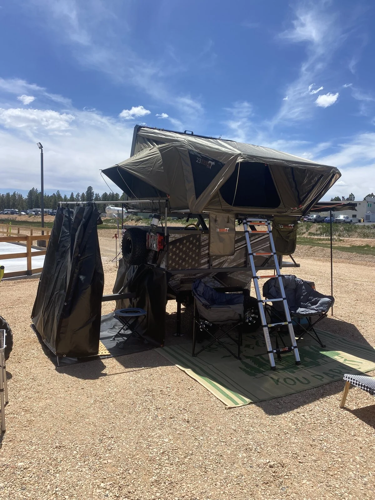 After several camping trips we started adding improvements and refining the trailer itself. We managed to lighten it up a couple hundred pounds, made one with a rooftop tent, added a shower/privacy attachment and onboard water storage, an Awning on the RTT version and closed in the area under the deck for a storage compartment.