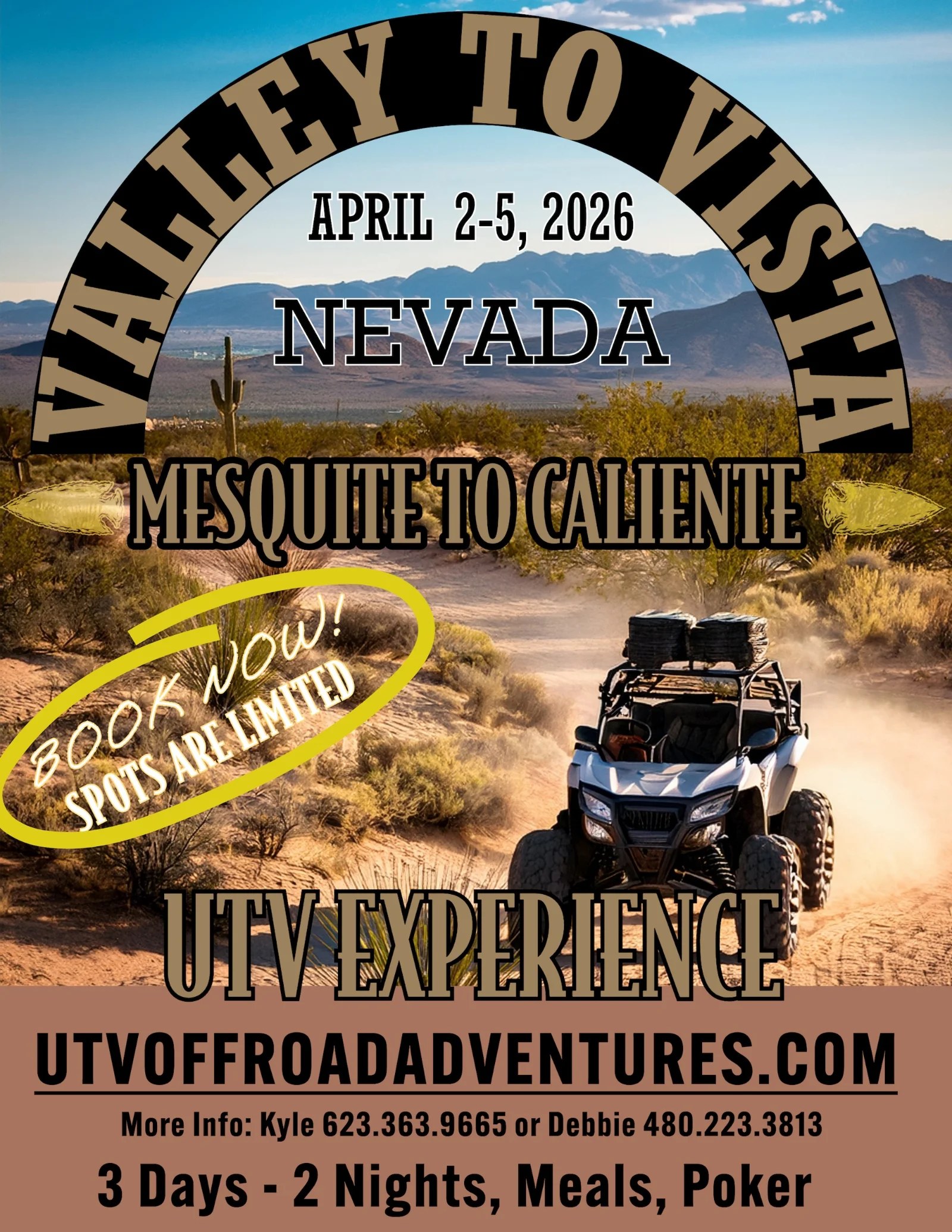 Join us for an unforgettable 3-day, 2-night UTV ride through some of Nevada’s most dramatic and diverse terrain. Starting in the vibrant desert city of Mesquite, Nevada, this guided adventure takes you deep into canyons, across desert flats, over colorful mesas, and through cool pine forests as you ride toward the historic town of Caliente.