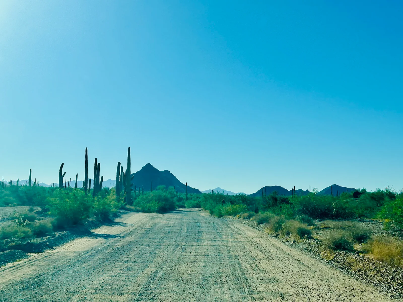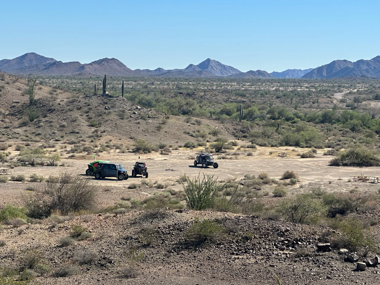The weather was perfect — cool and crisp in the morning, warm and sunny through the day. The beauty of the desert was on full display: endless stretches of golden sand, volcanic rock formations, bright green ocotillo in bloom, and towering saguaros standing tall against the blue sky.