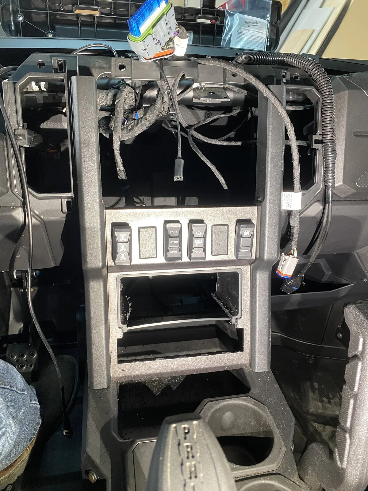 So yeah, I have coms and radio… but we did ours before Rugged had a solution for the Xpeditions. Also mine and my brother’s Xpeditions are Ultimates, so I cut out the bottom row of switches and the pocket where the hvac controls would be, and built my own mounting plate.